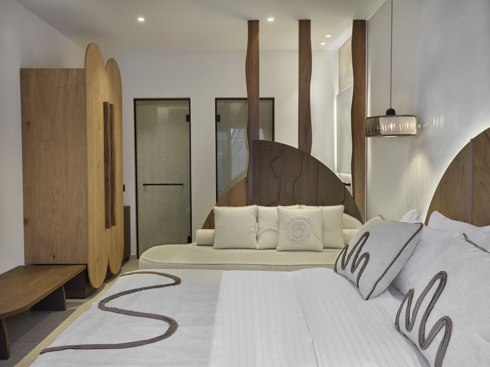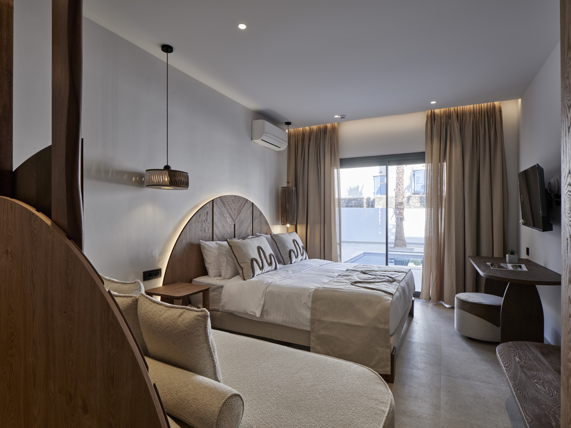 Το Luxury Triple Room with Shared Pool προσφέρει στυλ και άνεση για παρέες ή οικογένειες που αναζητούν εκλεπτυσμένη φιλοξενία σε ένα κυκλαδίτικο περιβάλλον. Το κομψό αυτό δωμάτιο διαθέτει άνετο κρεβάτι king-size και ένα επιπλέον μονό κρεβάτι, αποτελώντας την ιδανική επιλογή για έως και τρεις επισκέπτες χωρίς συμβιβασμούς στην αισθητική. Οι εσωτερικοί χώροι είναι διακοσμημένοι με φυσικούς τόνους, χειροποίητες υφές και minimal διακόσμηση. Οι επισκέπτες απολαμβάνουν πρόσβαση στην κοινόχρηστη πισίνα, ειδυλλιακό προορισμό για δροσιστικές βουτιές ή χαλαρωτικά απογεύματα κάτω από τον ήλιο.
