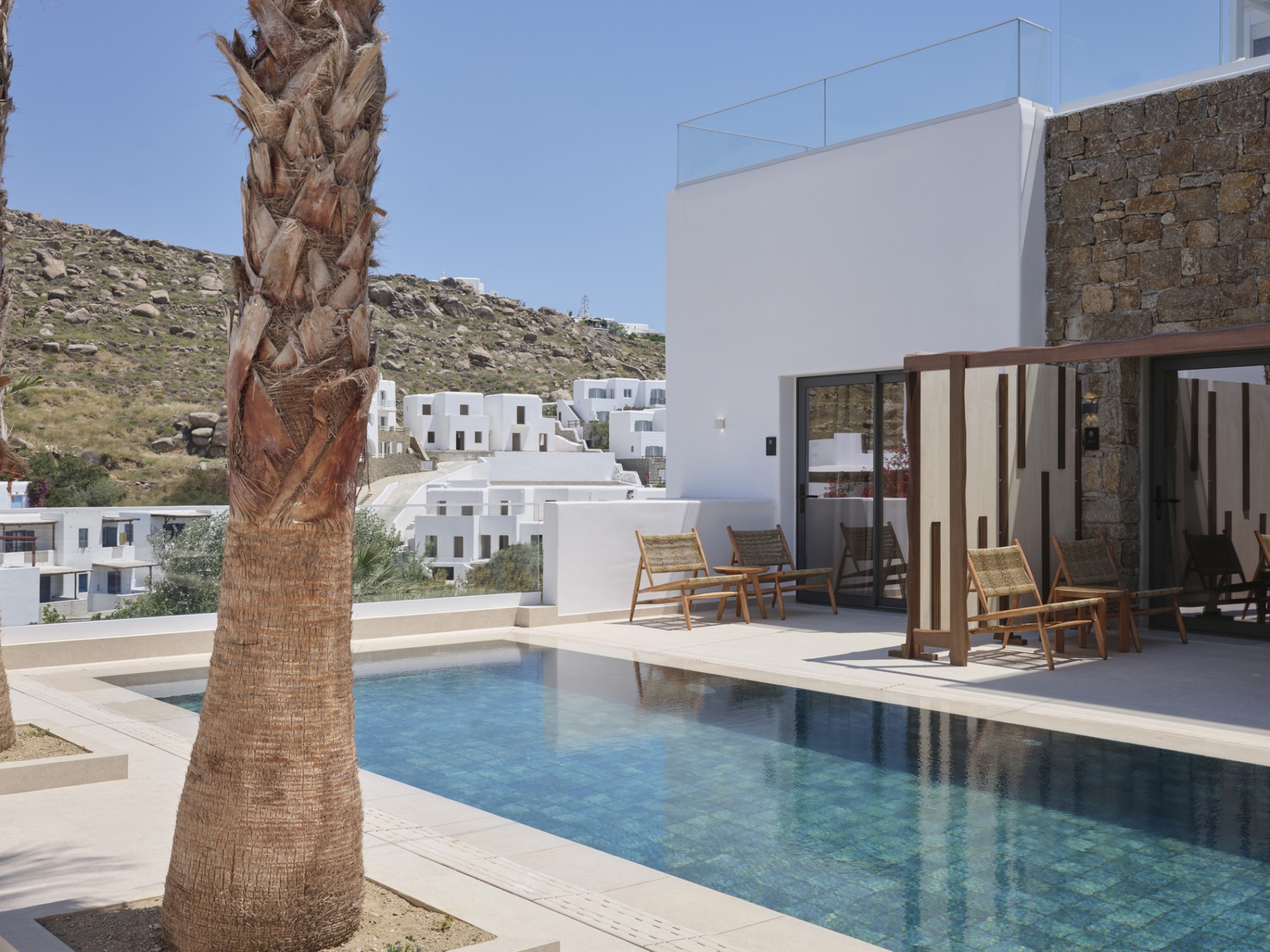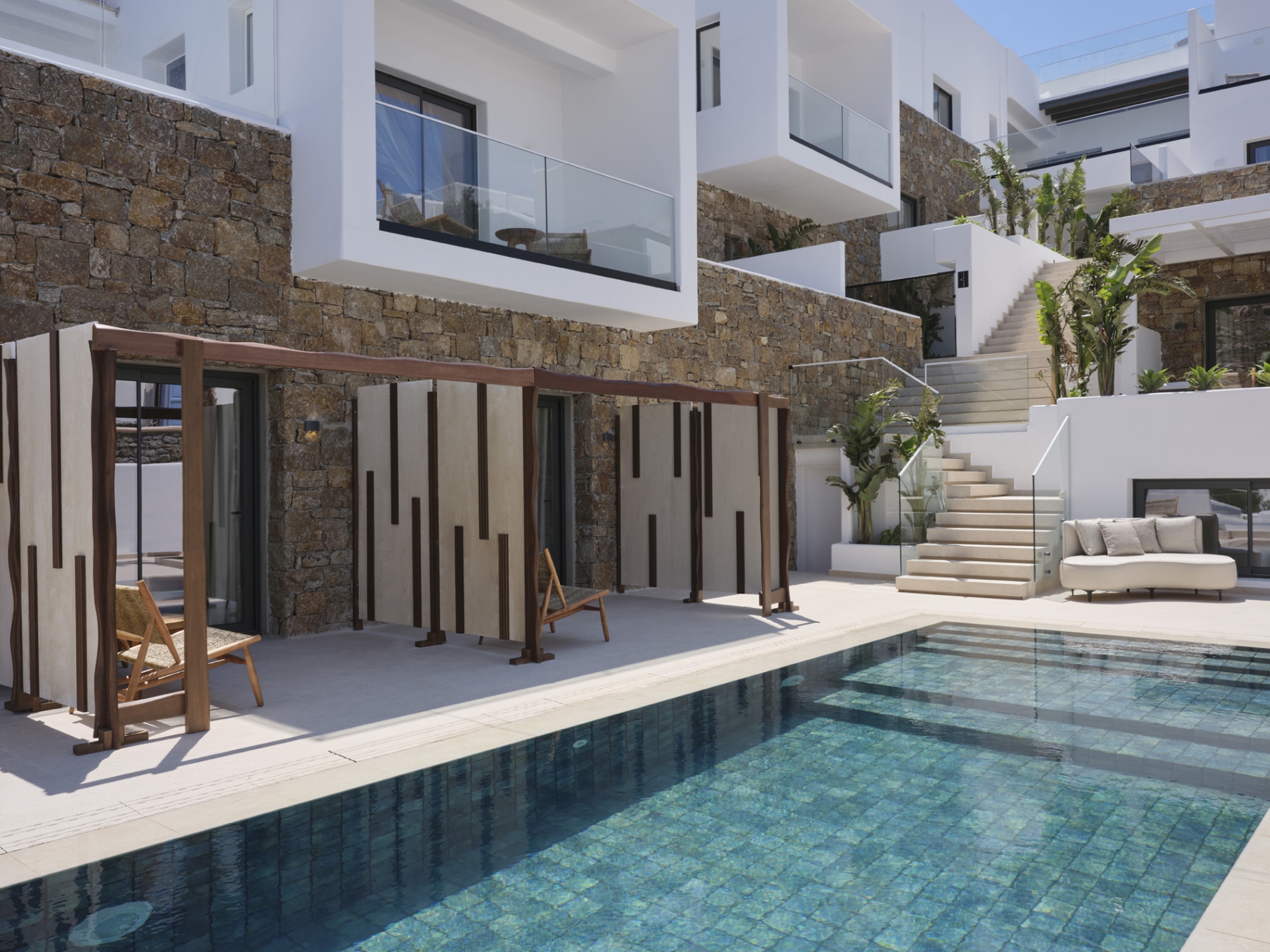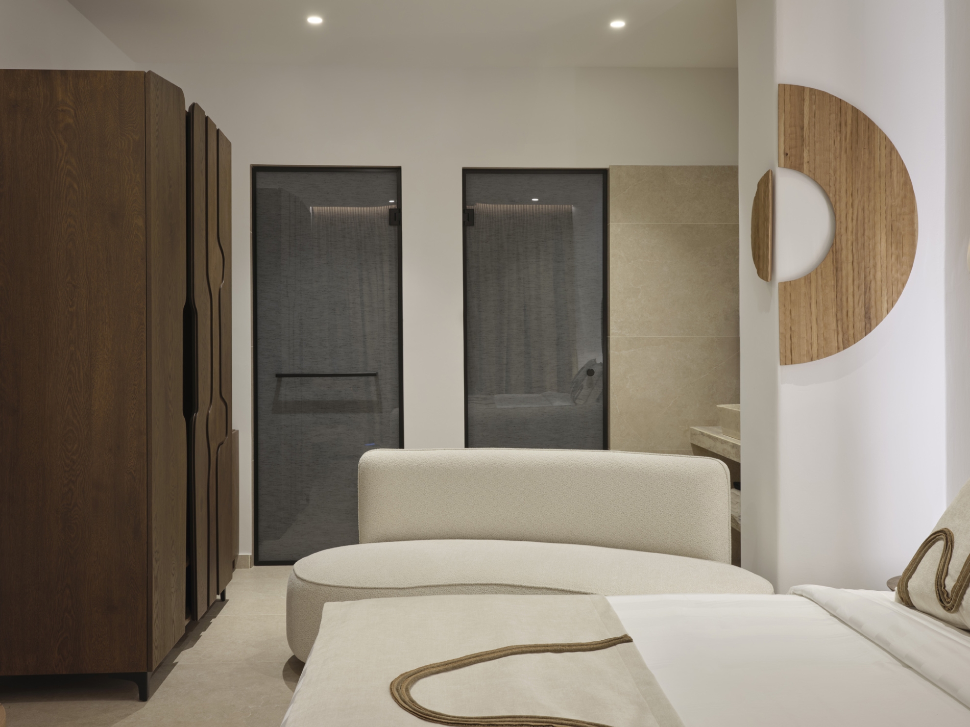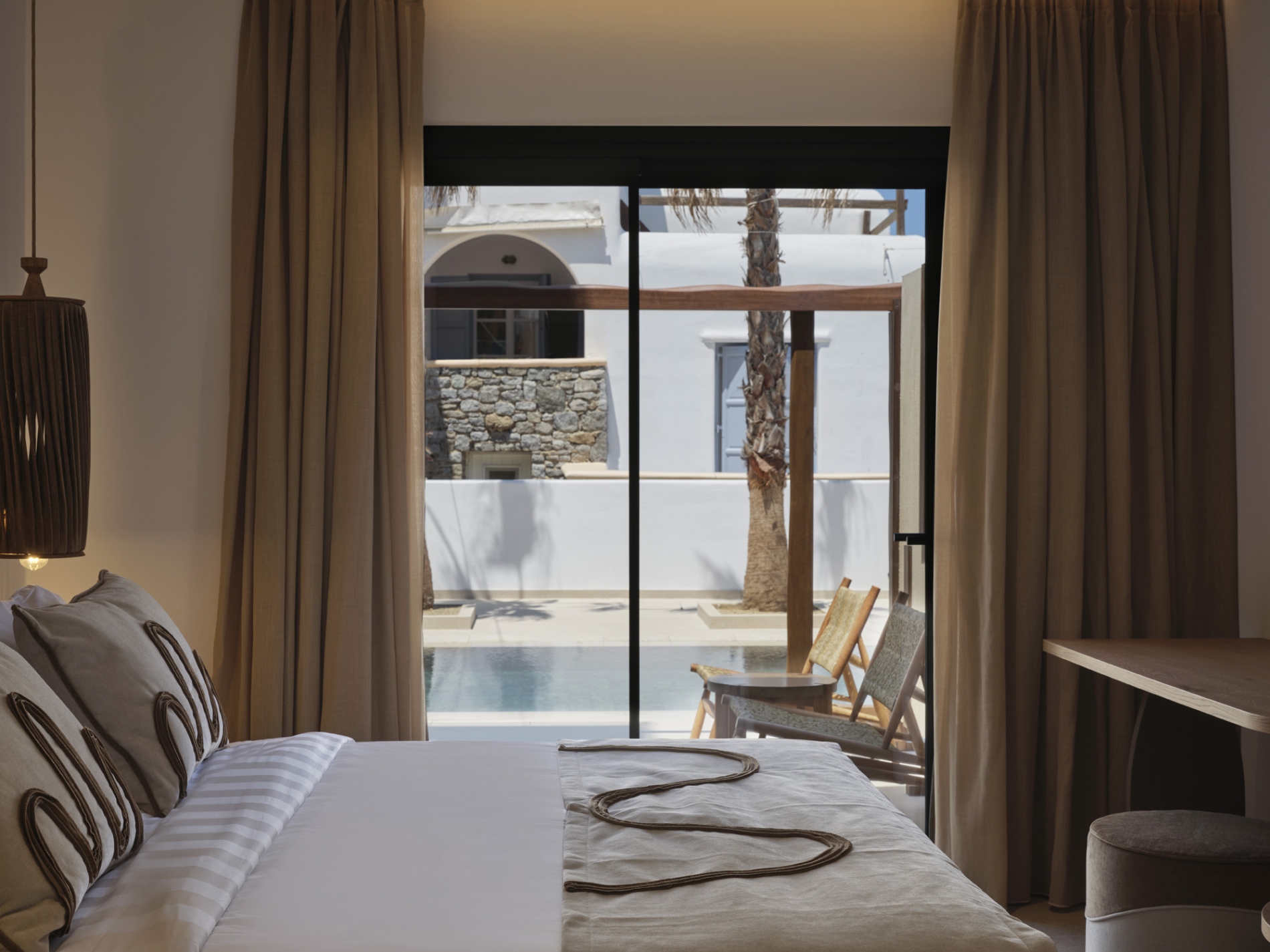 Η Cozy Suite with Shared Pool στο Iria Blue Mykonos αποτελεί ένα ήρεμο καταφύγιο, ιδανικό για ζευγάρια ή solo ταξιδιώτες που αναζητούν διακριτική πολυτέλεια σε ένα γαλήνιο περιβάλλον. Η κομψή σουίτα συνδυάζει τη μινιμαλιστική κυκλαδίτικη αισθητική με ζεστές, γήινες αποχρώσεις, δημιουργώντας μια ατμόσφαιρα χαλάρωσης που αποτυπώνει την ανεπιτήδευτη ομορφιά της Μυκόνου. Στο εσωτερικό, οι επισκέπτες απολαμβάνουν ένα άνετο κρεβάτι queen-size και φουτουριστικά έπιπλα που προσδίδουν στυλ και άνεση. Το μοντέρνο μπάνιο με ντουζιέρα και πολυτελή προϊόντα περιποίησης προσθέτει μια αίσθηση φροντίδας και ευεξίας. Η κοινόχρηστη πισίνα σας προσκαλεί να χαλαρώσετε κάτω από τον μυκονιάτικο ήλιο, είτε με μια δροσιστική βουτιά είτε με ένα βιβλίο στο χέρι δίπλα στο νερό.
